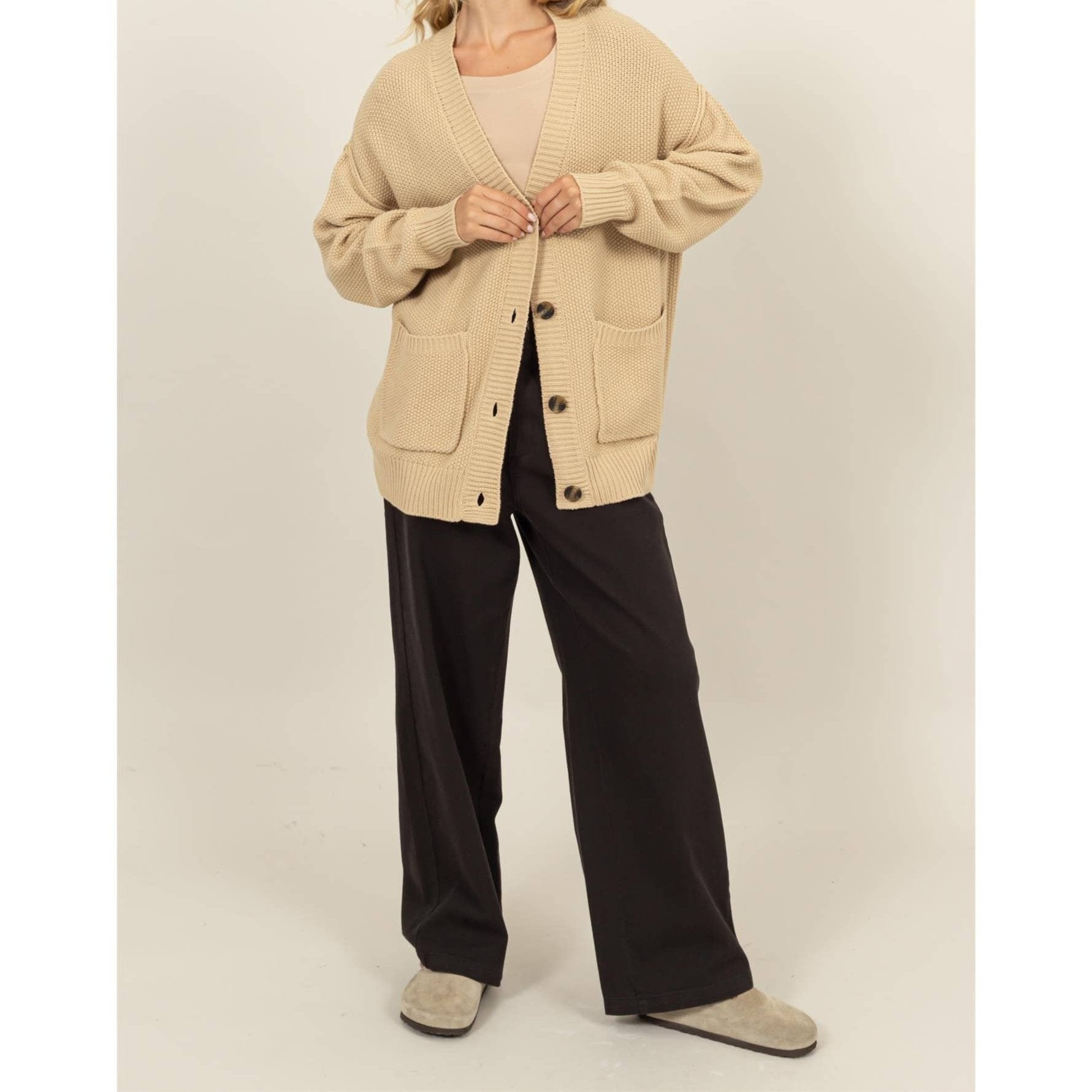 Indulge in cozy and chic fashion with this over sized button-up cardigan. Its relaxed fit and spacious front pockets provide both practicality and style. The thick knit texture offers warmth and comfort, while the large buttons elevate the design.